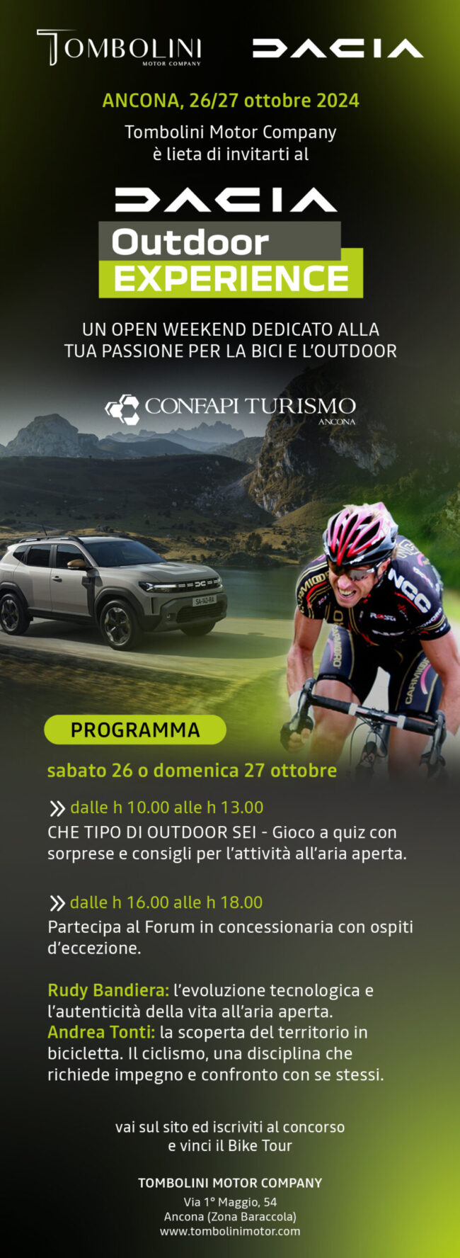 Ancona, sabato 26 e domenica 27 ottobre 2024, presso Tombolini Motor Company, con Andrea Tonti, professionista del ciclismo a livello agonistico e fondatore di Bike Division Tour Operator, e Rudi Bandiera. #confapiancona #tombolinimotorcompany