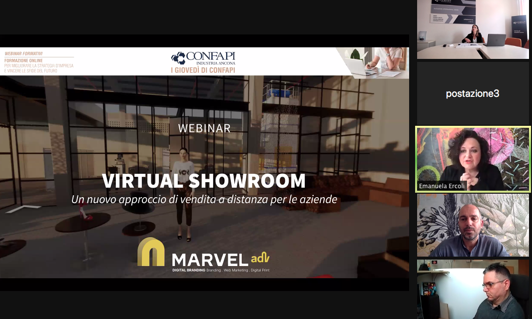 Il quinto appuntamento del 2’ ciclo di Webinar Informativi “I Giovedì di Confapi” ha proposto un approfondimento che riguarda un nuovo approccio di vendita a distanza per le aziende attraverso la creazione di uno showroom per il quale servono professionalità diverse. L’intervento ha avuto come protagonisti Emanuela Ercoli, Art Director e Antonio Rignanese, Digital & Inbound Marketing Specialist di Marvel Adv.